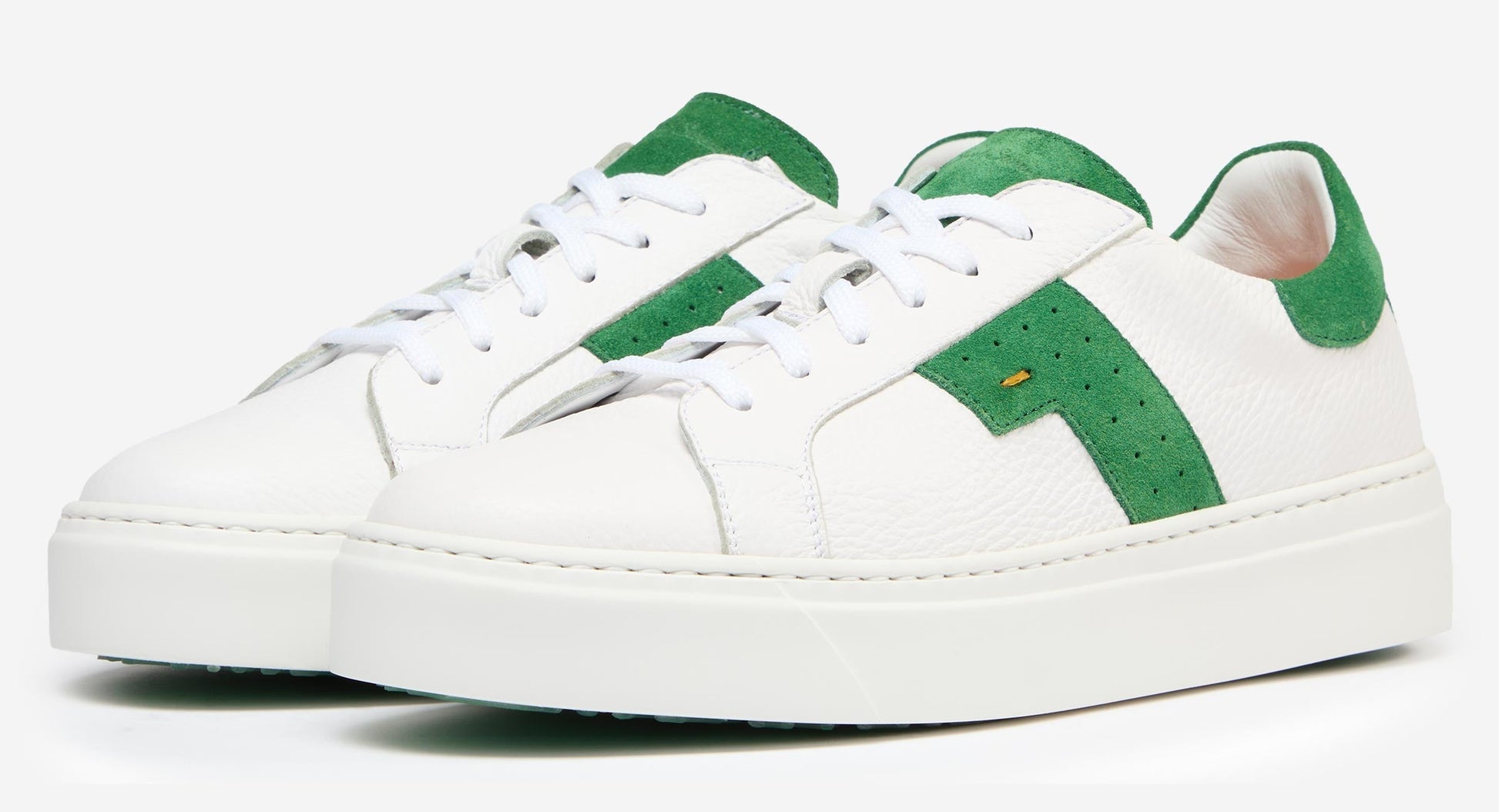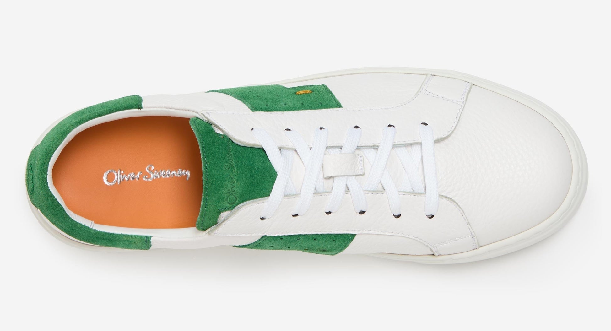 Our new premium trainers are made in Spain from white deerskin - a supple but strong leather with a naturally grainy texture. The classic lace to toe style is heightened with flashes of green soft calf suede around the collar, tongue top and quarters. We have added some gentle cushioning around the collar and back counter for comfort and a full supersoft calf leather lining and removable cushioned leather insock. The sole adds a point of difference; we have chosen a new, lightweight, smooth sided rubber cupsole with a deep, wide profile secured with a side stitch. The base of the sole has our new Oliver Sweeney branded green insert with a clear rubber coating.