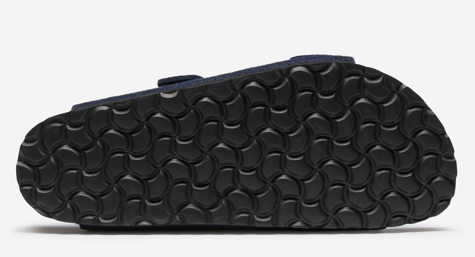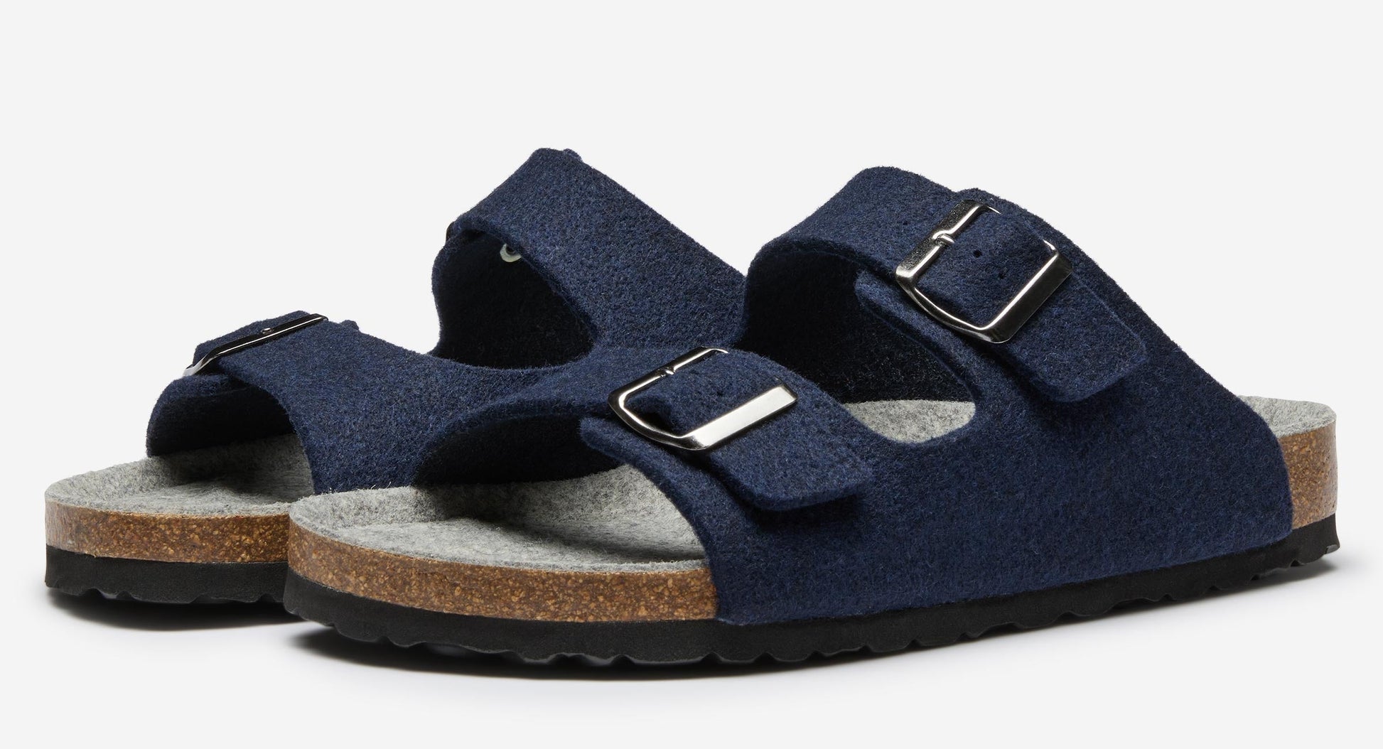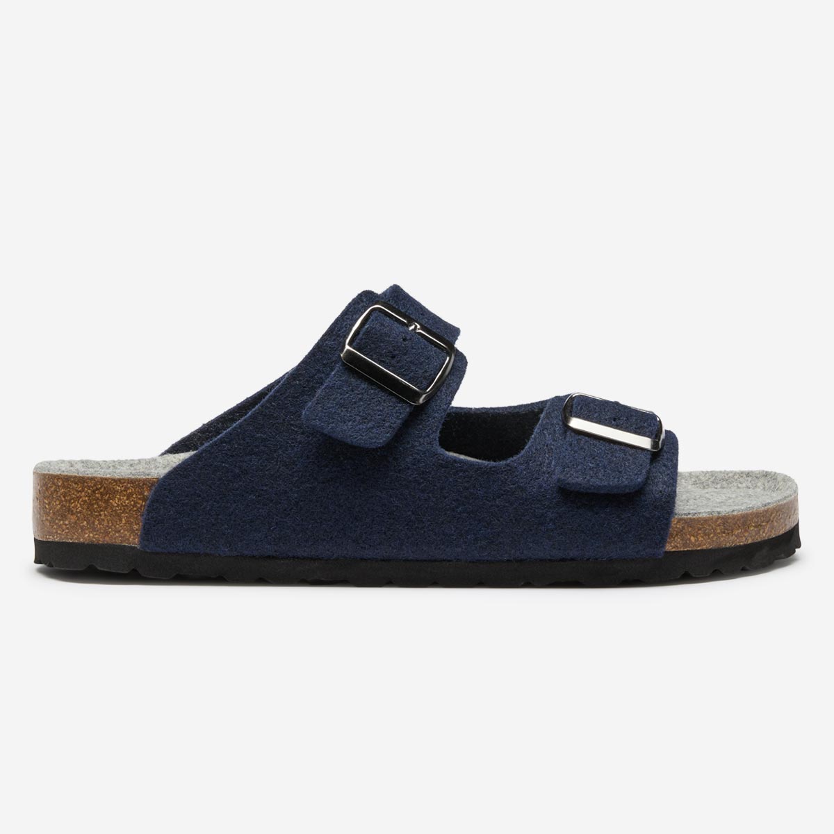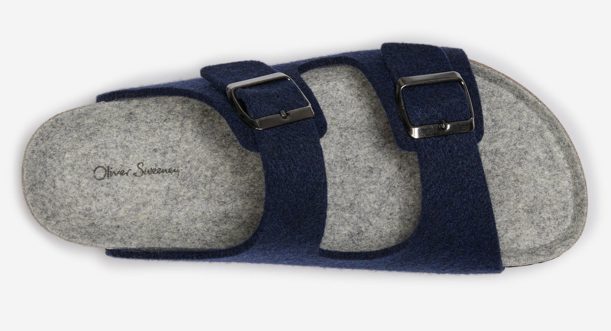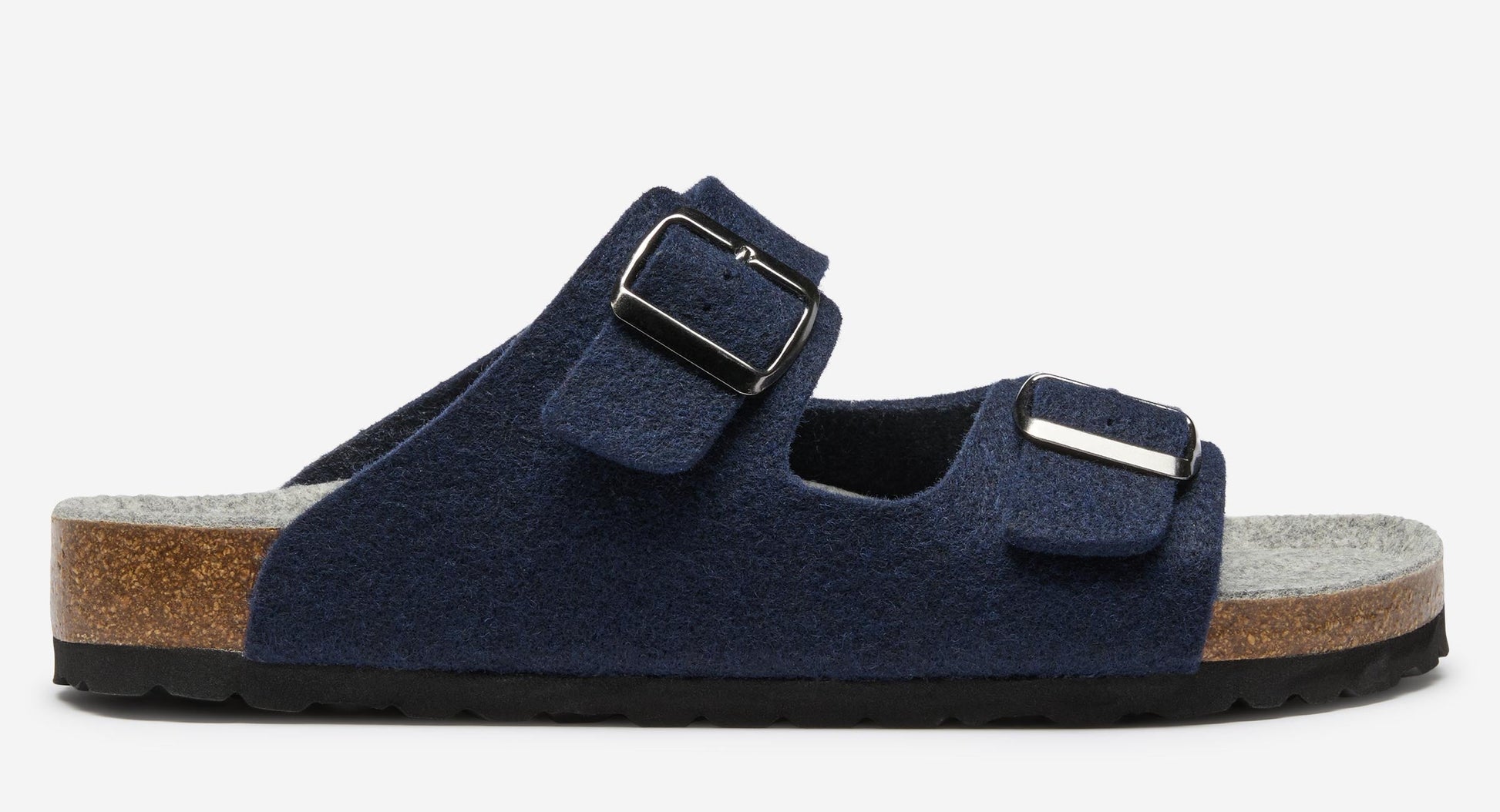 Our super comfy felt double strap slipper is from our specialist factory in Spain. The moulded cork footbed is topped with a soft suede insole with an additional layer of padding, supporting the arch of the foot and we’ve added a practical outdoor EVA sole. The felt upper is made from a navy marl wool and moulded around the last to maintain its shape with two adjustable straps with antiqued metal buckles – a great, practical, modern slipper.