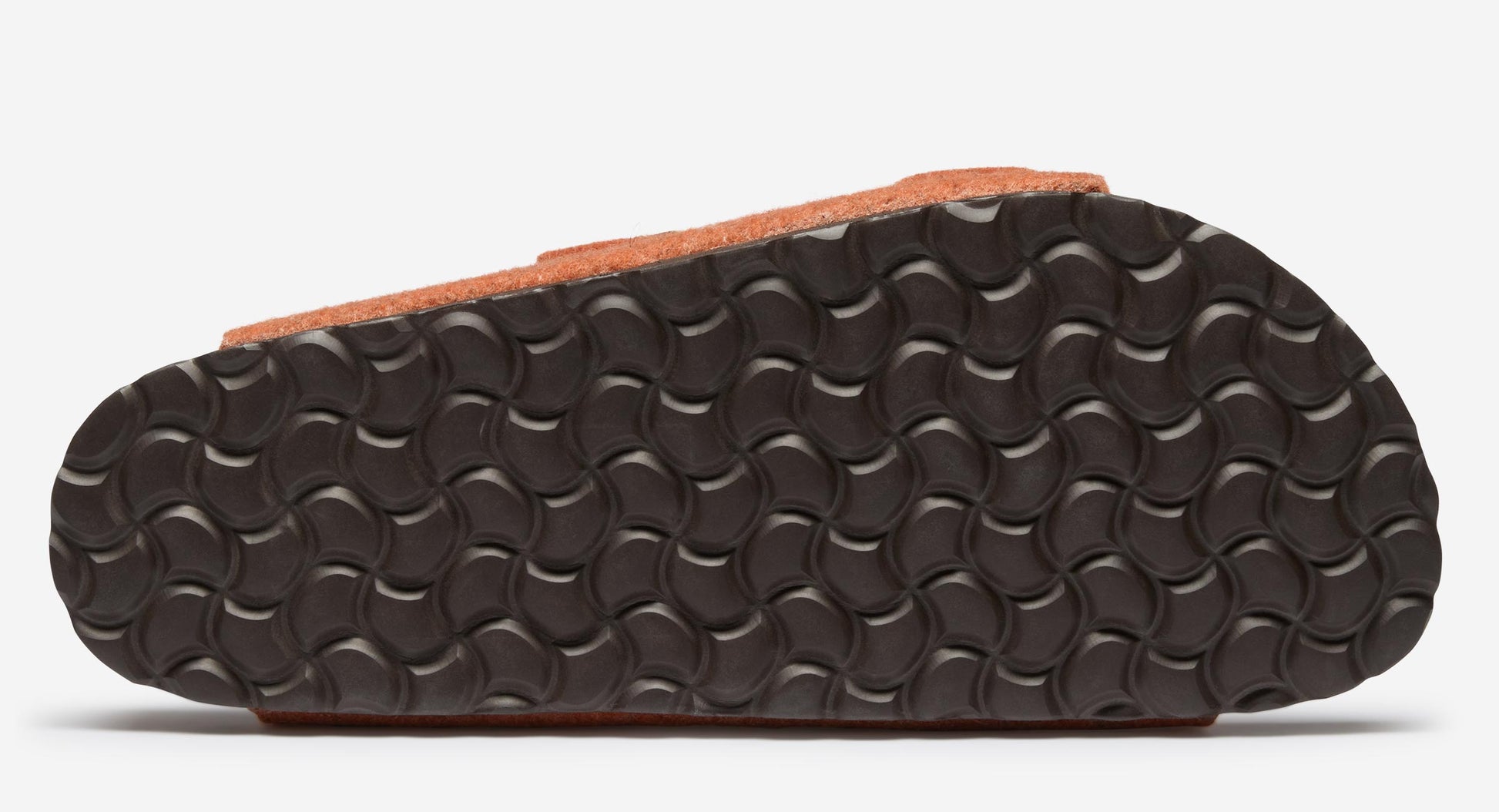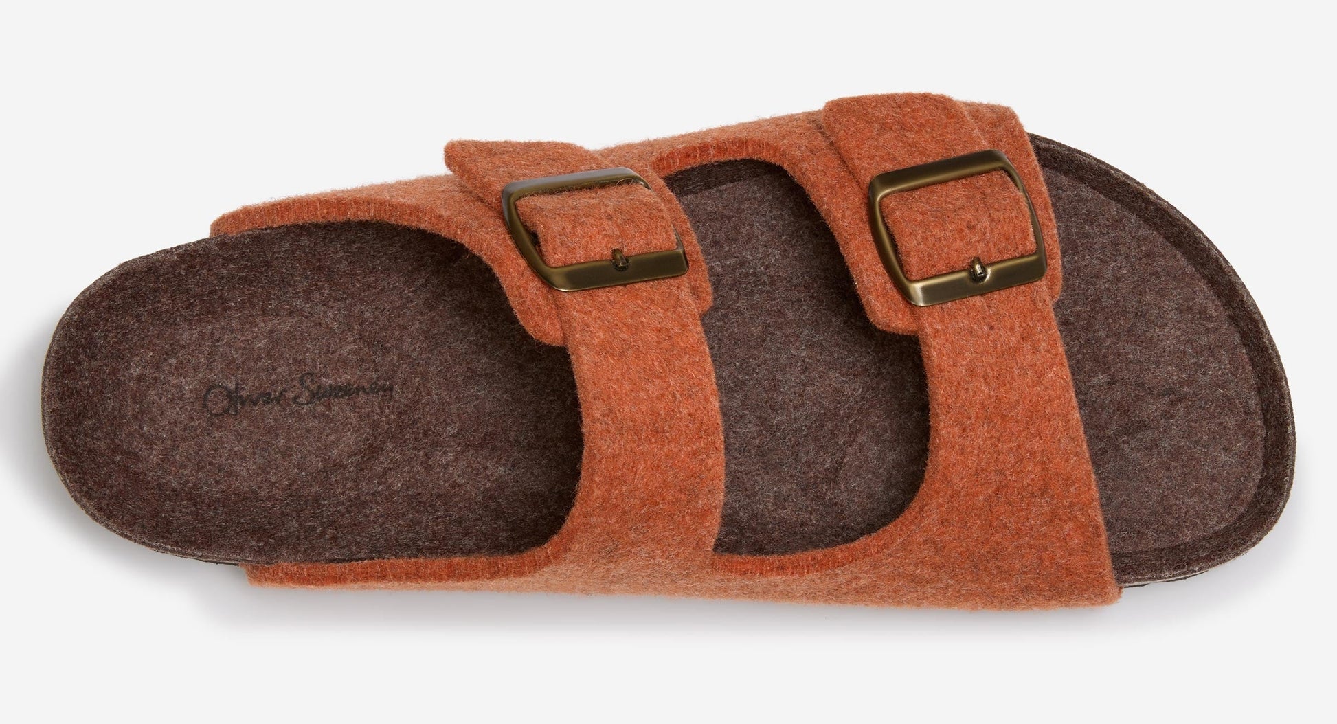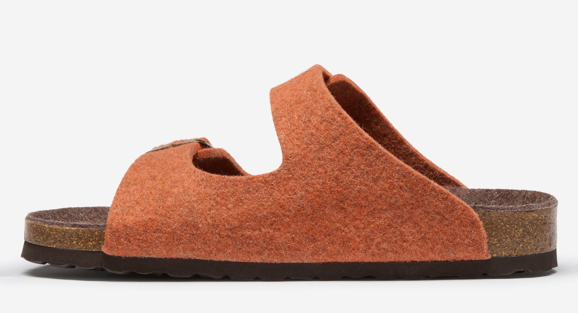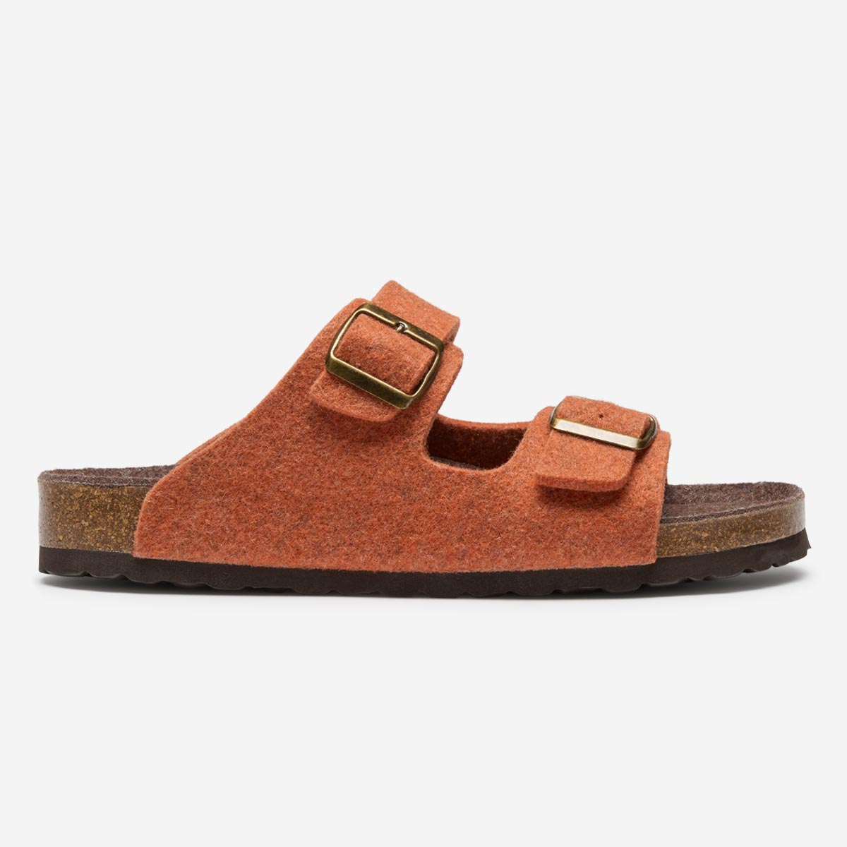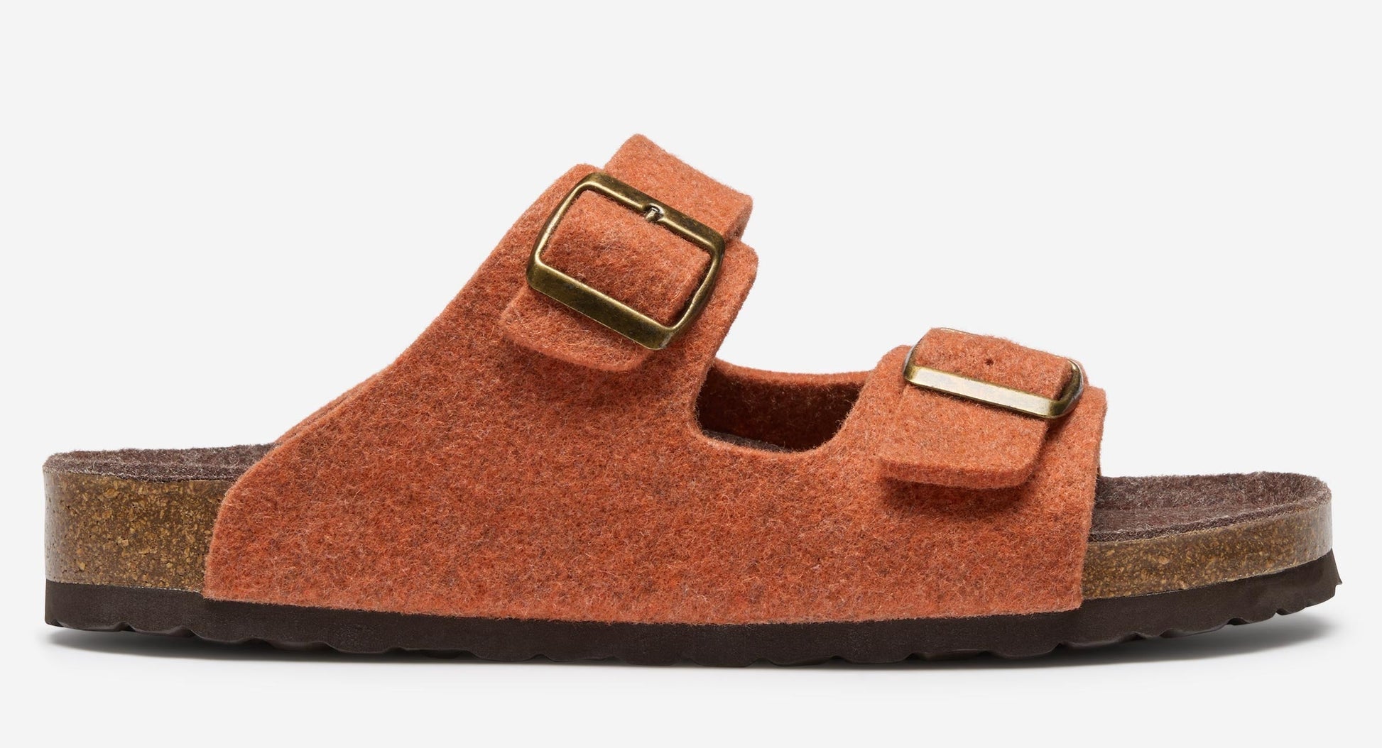Our super comfy felt double strap slipper is from our specialist factory in Spain. The moulded cork footbed is topped with a soft suede insole with an additional layer of padding, supporting the arch of the foot and we’ve added a practical outdoor EVA sole. The felt upper is made from an orange marl wool and moulded around the last to maintain its shape with two adjustable straps with antiqued metal buckles – a great, practical, modern slipper.